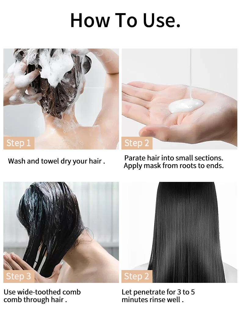 The hair mask features a rich, creamy texture that glides smoothly on hair, deeply nourishes without weighing hair down or leaving it greasy. It absorbs quickly into the hair cuticle, rinses off effortlessly with warm water, leaving no residue—after use, hair is soft, smooth and bouncy, not flat or sticky, ideal for daily or weekly use in both dry and humid climates.