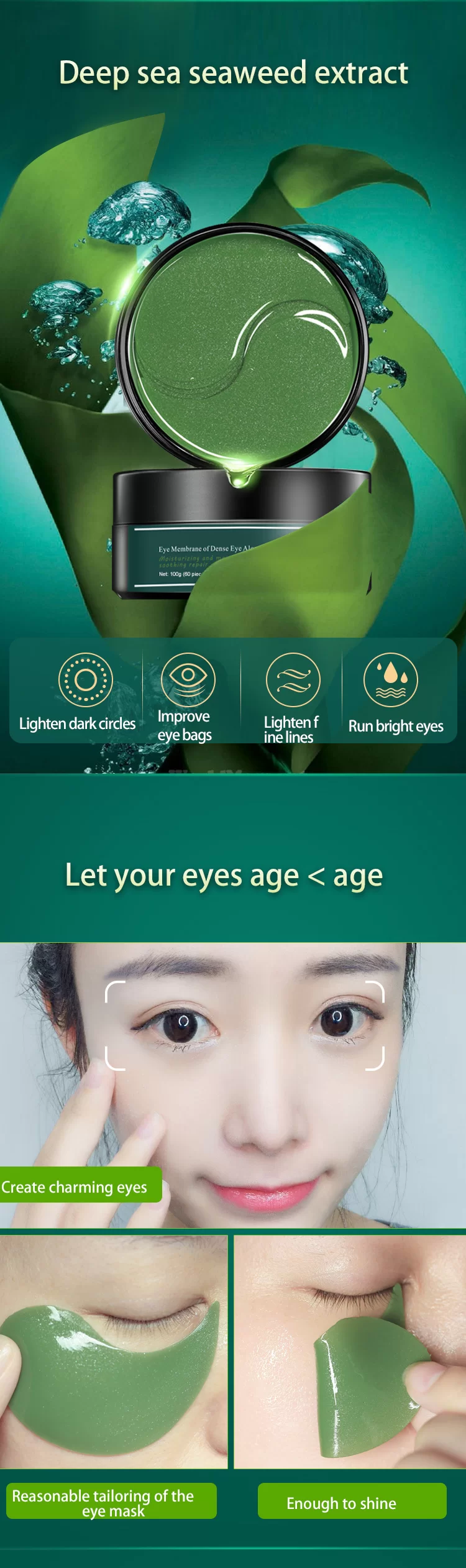 Multiple natural plant ingredients: Seaweed Extract, Aloe Vera Extract, Cucumber Extract, Green Tea Extract—all gentle and skin-friendly, suitable for the delicate eye area.