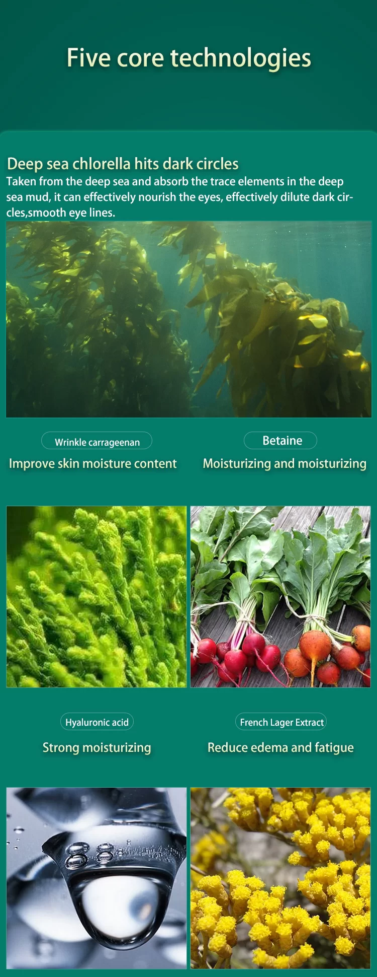 Seaweed Extract: Natural hydrating and nourishing star, rich in minerals and antioxidants, deeply replenishes moisture to the delicate eye skin, reduces dry fine lines, and improves skin elasticity—perfect for all eye skin types in both markets.