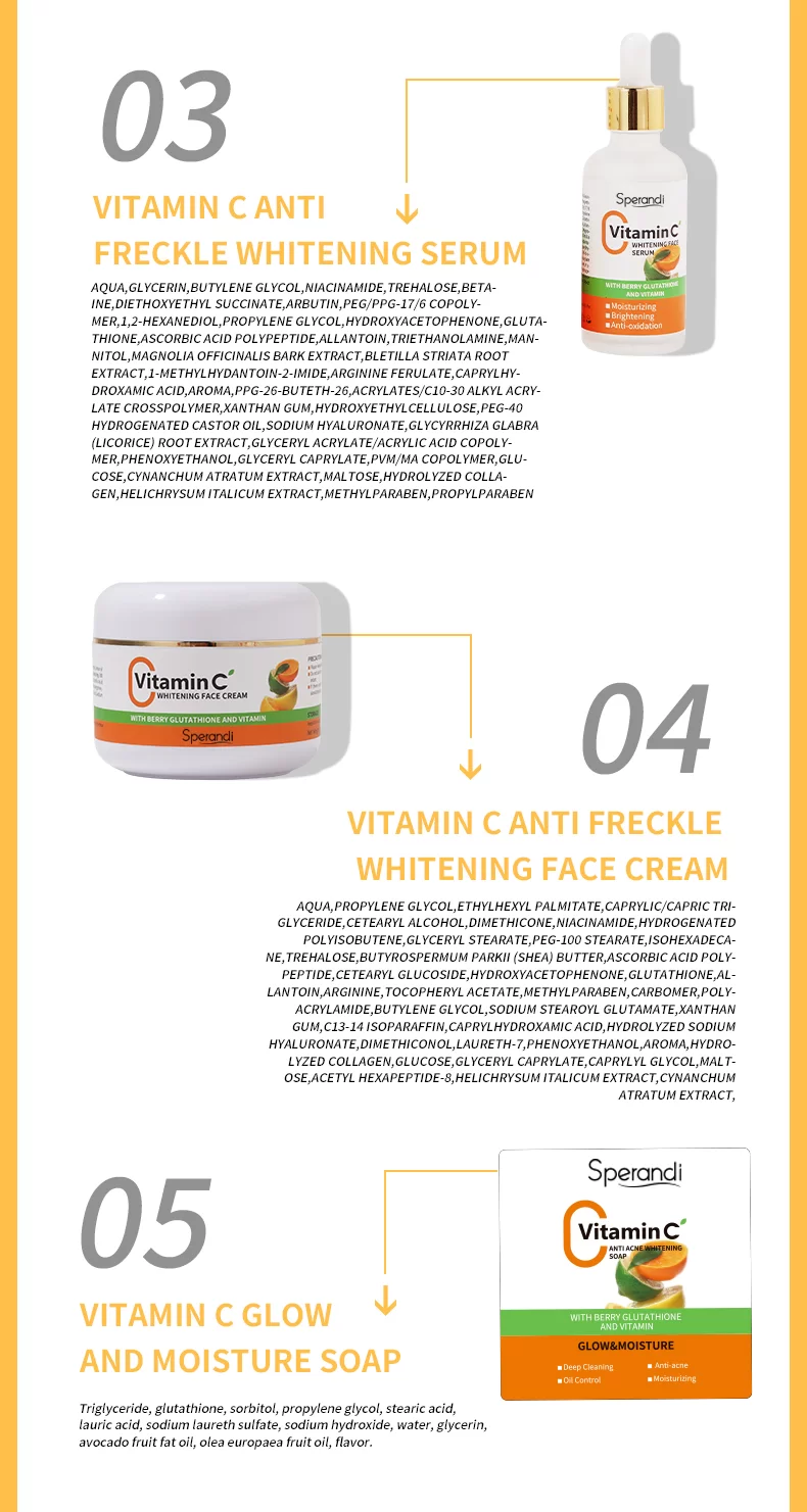 Vitamin C (Ascorbic Acid): A star brightening ingredient, inhibits melanin overproduction, fades dark spots, sun spots and uneven tone, while antioxidant, delaying skin aging and enhancing skin radiance—perfect for both markets.